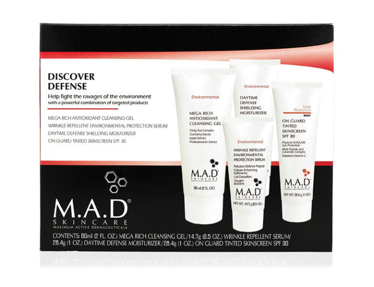 {"id":9211425652973,"title":"Discover Defense Skincare Kit with SPF 30 Tinted Sunscreen, Anti-Aging","handle":"discover-defense-skincare-kit-with-spf-30-tinted-sunscreen-anti-aging","description":"\u003ch2 data-start=\"204\" data-end=\"241\"\u003e💗 Discover Defense Skincare Kit\u003c\/h2\u003e\n\u003cp data-start=\"242\" data-end=\"317\"\u003e\u003cstrong data-start=\"242\" data-end=\"317\"\u003eAntioxidant-Rich Protection • Anti-Aging Support • SPF 30 Tinted Shield\u003c\/strong\u003e\u003c\/p\u003e\n\u003cp data-start=\"319\" data-end=\"697\"\u003eDefend your skin daily with \u003cstrong data-start=\"347\" data-end=\"385\"\u003eDiscover Defense by M.A.D Skincare\u003c\/strong\u003e — the powerful anti-aging, pollution-shielding kit designed to keep your complexion radiant, hydrated, and protected from the elements. This complete trio guards your skin from environmental stress, UV damage, and free-radical breakdown, helping to maintain firmness, smooth texture, and an even, youthful glow.\u003c\/p\u003e\n\u003cp data-start=\"699\" data-end=\"811\"\u003ePerfect for anyone who wants age-prevention made simple: nourish, protect, and defend — all in one easy routine.\u003c\/p\u003e\n\u003chr data-start=\"813\" data-end=\"816\"\u003e\n\u003ch3 data-start=\"818\" data-end=\"854\"\u003e💗 What’s Inside the Defense Kit\u003c\/h3\u003e\n\u003cul data-start=\"856\" data-end=\"1315\"\u003e\n\u003cli data-start=\"856\" data-end=\"1016\"\u003e\n\u003cp data-start=\"858\" data-end=\"1016\"\u003e\u003cstrong data-start=\"858\" data-end=\"917\"\u003eEnvironmental Defense SPF 30 Tinted Moisturizer (1 oz.)\u003c\/strong\u003e\u003cbr data-start=\"917\" data-end=\"920\"\u003eBroad-spectrum UV protection + a natural tint for a soft, even-tone finish without white cast.\u003c\/p\u003e\n\u003c\/li\u003e\n\u003cli data-start=\"1018\" data-end=\"1166\"\u003e\n\u003cp data-start=\"1020\" data-end=\"1166\"\u003e\u003cstrong data-start=\"1020\" data-end=\"1058\"\u003eEnvironmental Detox Mask (0.5 oz.)\u003c\/strong\u003e\u003cbr data-start=\"1058\" data-end=\"1061\"\u003eDraws out impurities, pollution particles, and congestion while supporting skin clarity and resilience.\u003c\/p\u003e\n\u003c\/li\u003e\n\u003cli data-start=\"1168\" data-end=\"1315\"\u003e\n\u003cp data-start=\"1170\" data-end=\"1315\"\u003e\u003cstrong data-start=\"1170\" data-end=\"1210\"\u003eAntioxidant Defense Serum (0.25 oz.)\u003c\/strong\u003e\u003cbr data-start=\"1210\" data-end=\"1213\"\u003eTargets fine lines, dullness, and oxidative stress with skin-reviving actives for youthful vibrance.\u003c\/p\u003e\n\u003c\/li\u003e\n\u003c\/ul\u003e\n\u003chr data-start=\"1317\" data-end=\"1320\"\u003e\n\u003ch3 data-start=\"1322\" data-end=\"1351\"\u003e💗 Skin-Loving Benefits\u003c\/h3\u003e\n\u003cp data-start=\"1352\" data-end=\"1385\"\u003e(Think \u003cem data-start=\"1359\" data-end=\"1371\"\u003epink icons\u003c\/em\u003e on your page)\u003c\/p\u003e\n\u003cp data-start=\"1387\" data-end=\"1742\"\u003e💗 Shields skin from UV rays, blue light + pollution\u003cbr data-start=\"1439\" data-end=\"1442\"\u003e💗 Helps reduce signs of premature aging + fine lines\u003cbr data-start=\"1495\" data-end=\"1498\"\u003e💗 Antioxidant boost for brighter tone + renewed glow\u003cbr data-start=\"1551\" data-end=\"1554\"\u003e💗 Protects the moisture barrier while calming the skin\u003cbr data-start=\"1609\" data-end=\"1612\"\u003e💗 Tinted SPF offers sheer, natural coverage (no makeup needed!)\u003cbr data-start=\"1676\" data-end=\"1679\"\u003e💗 Perfect everyday starter kit for age-prevention + protection\u003c\/p\u003e\n\u003chr data-start=\"1744\" data-end=\"1747\"\u003e\n\u003ch3 data-start=\"1749\" data-end=\"1765\"\u003e💗 Best For:\u003c\/h3\u003e\n\u003cp data-start=\"1767\" data-end=\"1922\"\u003e✔ Early signs of aging\u003cbr data-start=\"1789\" data-end=\"1792\"\u003e✔ Skin exposed to sun, screens, or city pollution\u003cbr data-start=\"1841\" data-end=\"1844\"\u003e✔ Dull, tired, or stressed skin\u003cbr data-start=\"1875\" data-end=\"1878\"\u003e✔ Daily lightweight protection + nourishment\u003c\/p\u003e\n\u003chr data-start=\"1924\" data-end=\"1927\"\u003e\n\u003ch3 data-start=\"1929\" data-end=\"1961\"\u003eDefend Your Glow — Every Day\u003c\/h3\u003e\n\u003cp data-start=\"1963\" data-end=\"2147\"\u003eHealthy skin starts with consistent defense. With this kit, you protect against what causes aging \u003cstrong data-start=\"2061\" data-end=\"2081\"\u003ebefore it begins\u003c\/strong\u003e, while boosting hydration, brightness, and overall skin vitality.\u003c\/p\u003e\n\u003cp data-start=\"2149\" data-end=\"2254\"\u003e💗 \u003cstrong data-start=\"2152\" data-end=\"2254\"\u003eAdd this kit to your routine for firm, bright, protected skin — beautifully effortless, every day.\u003c\/strong\u003e\u003c\/p\u003e\n\u003cp\u003e\u003cbr\u003e\u003cbr\u003e\u003c\/p\u003e\n\u003ctable width=\"100%\"\u003e\n\u003ctbody\u003e\n\u003ctr\u003e\n\u003ctd\u003e\u003cstrong\u003eKit Contents\u003c\/strong\u003e\u003c\/td\u003e\n\u003ctd\u003eMega Rich Cleansing Gel (2 fl. oz.), Wrinkle Repellent Serum (0.5 oz.), Daytime Defense Moisturizer (1 oz.), On Guard Tinted Skinscreen SPF 30 (1 oz.)\u003c\/td\u003e\n\u003c\/tr\u003e\n\u003ctr\u003e\n\u003ctd\u003e\u003cstrong\u003eBrand\u003c\/strong\u003e\u003c\/td\u003e\n\u003ctd\u003eM.A.D. Skincare\u003c\/td\u003e\n\u003c\/tr\u003e\n\u003ctr\u003e\n\u003ctd\u003e\u003cstrong\u003eSKU\u003c\/strong\u003e\u003c\/td\u003e\n\u003ctd\u003e277001\u003c\/td\u003e\n\u003c\/tr\u003e\n\u003ctr\u003e\n\u003ctd\u003e\u003cstrong\u003eIntended Skin Type\u003c\/strong\u003e\u003c\/td\u003e\n\u003ctd\u003eNormal to Combination; suitable for daily defense and anti-aging maintenance\u003c\/td\u003e\n\u003c\/tr\u003e\n\u003ctr\u003e\n\u003ctd\u003e\u003cstrong\u003eSPF\u003c\/strong\u003e\u003c\/td\u003e\n\u003ctd\u003eBroad-spectrum SPF 30 (tinted skinscreen)\u003c\/td\u003e\n\u